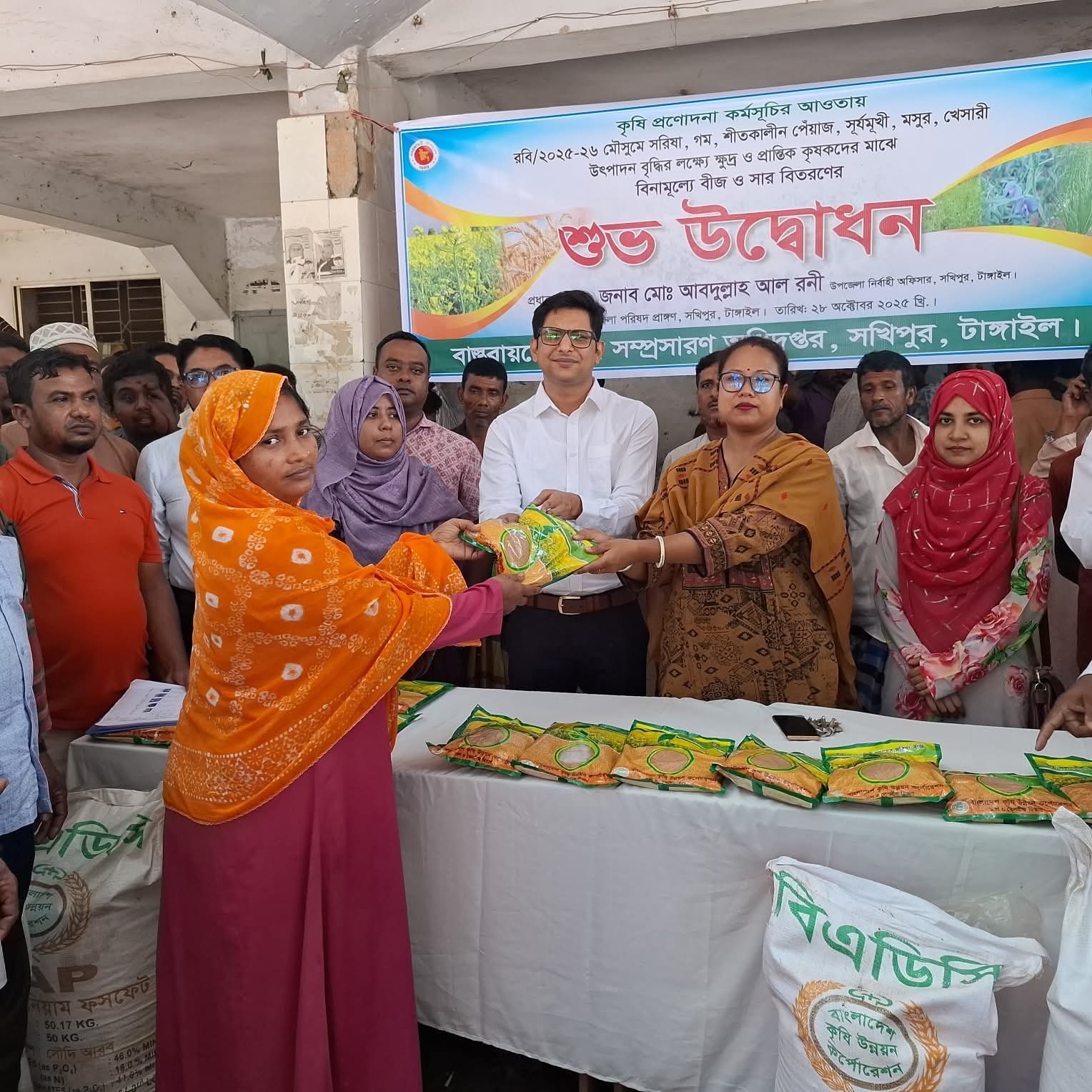 টাঙ্গাইলের সখিপুরে প্রান্তিক পর্যায়ের প্রায় ৫ হাজার কৃষকদের মাঝে বিনামূল্যে বীজ ও সার বিতরণ করা হয়েছে।উপজেলা পরিষদ প্রাঙ্গণে মঙ্গলবার (২৮অক্টোবর) সকালে এ কর্মসূচির উদ্বোধন করেন উপজেলা নির্বাহী অফিসার(ইউএনও) আব্দুল্লাহ আল রনী। জানা যায়, রবি/২০২৫-২৬ মৌসুমে সরিষা, গম, শীতকালীন পেঁয়াজ, সূর্যমূখী, মসুর, খেসারী উৎপাদন বৃদ্ধির লক্ষ্যে ক্ষুদ্র ও প্রান্তিক কৃষকদের মাঝে বিনামূল্যে এসব বীজ ও সার বিতরণ করা হয়।